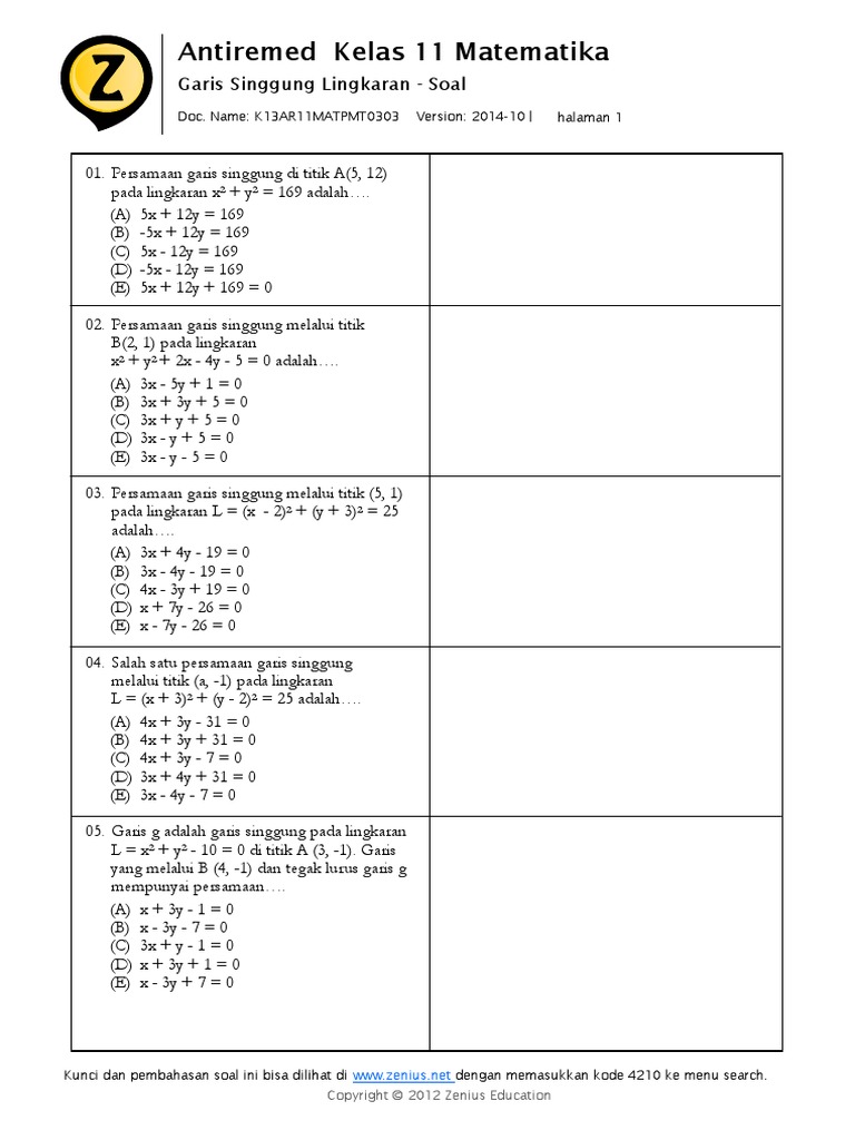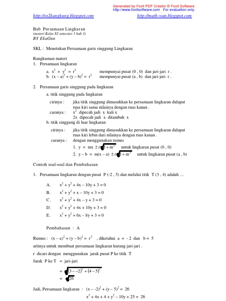 Unduh sebagai doc, pdf, txt atau baca. Bama nurrochman ringkasan materi lingkaran no : 20200429 soal pat matematika peminatan sma kelas 11 xi kurikulum 2013. Cintoh soal dan pembahasan materi kelas 11.ingkaran dari pernyataan semua makhluk. Download soal dan jawaban lingkaran kelas 11 doc. Belajar persamaan lingkaran materi matematika kelas 11 sma dengan contoh soal dan pembahasan. Artikel awal ini membahas persamaan lingkaran dengan pusat titik (0, 0), titik (a, b) dan bentuk umum persamaan lingkaran, garis singgung pada lingkaran dibahas pada artikel tersendiri. Contoh soal trigonometri kelas 11 dan kunci jawabannya. Apr 12, 2021 · di sini tersedia video pembahasan materi untuk pelajaran matematika peminatan sma kelas xi untuk kurikulum 2013 revisi. Dokumen serupa dengan soal lingkaran dan penyelesaiannya sma kelas xi semester 1. Contoh soal bab trigonometri dan pembahasannya. 20200623 soal latihan kelas 8 bab lingkaran doc berikut ini adalah soal latihan kelas 8 bab lingkaran doc yang bisa anda download secara gratis di website kami. Kelas 11 kurikulum 2013 revisi matematika wajib matematika peminatan bahasa inggris bahasa indonesia fisika kimia biologi ekonomi sosiologi geografi sejarah wajib sejarah peminatan kelas 12 kurikulum 2013 revisi.